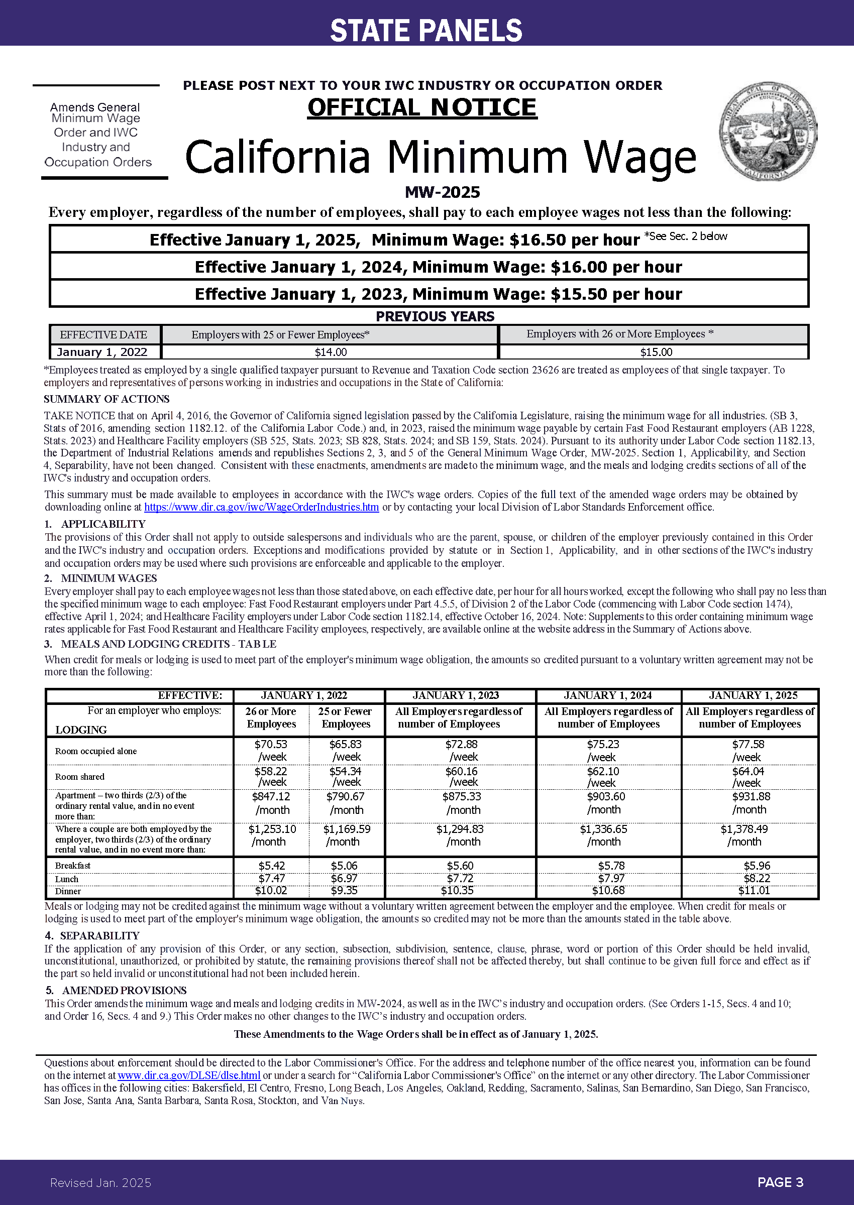 Copies of the full text of the amended wage orders may be obtained by downloading online at HERE or by contacting your local Division of Labor Standards Enforcement office