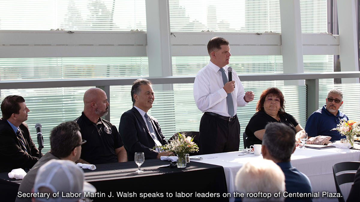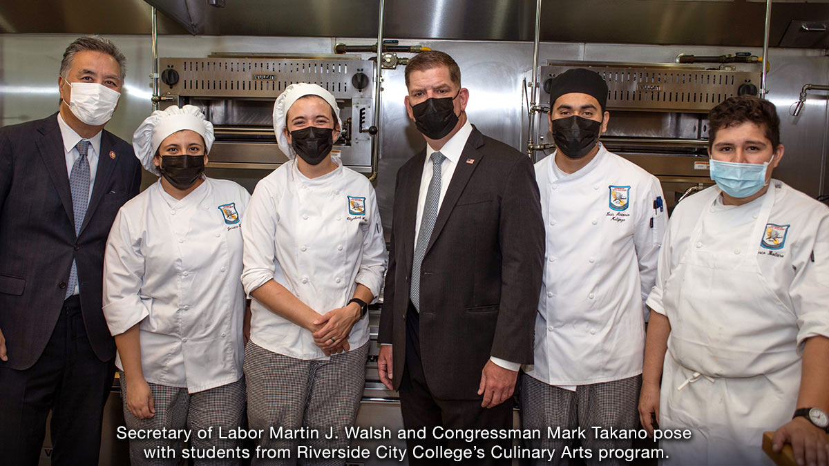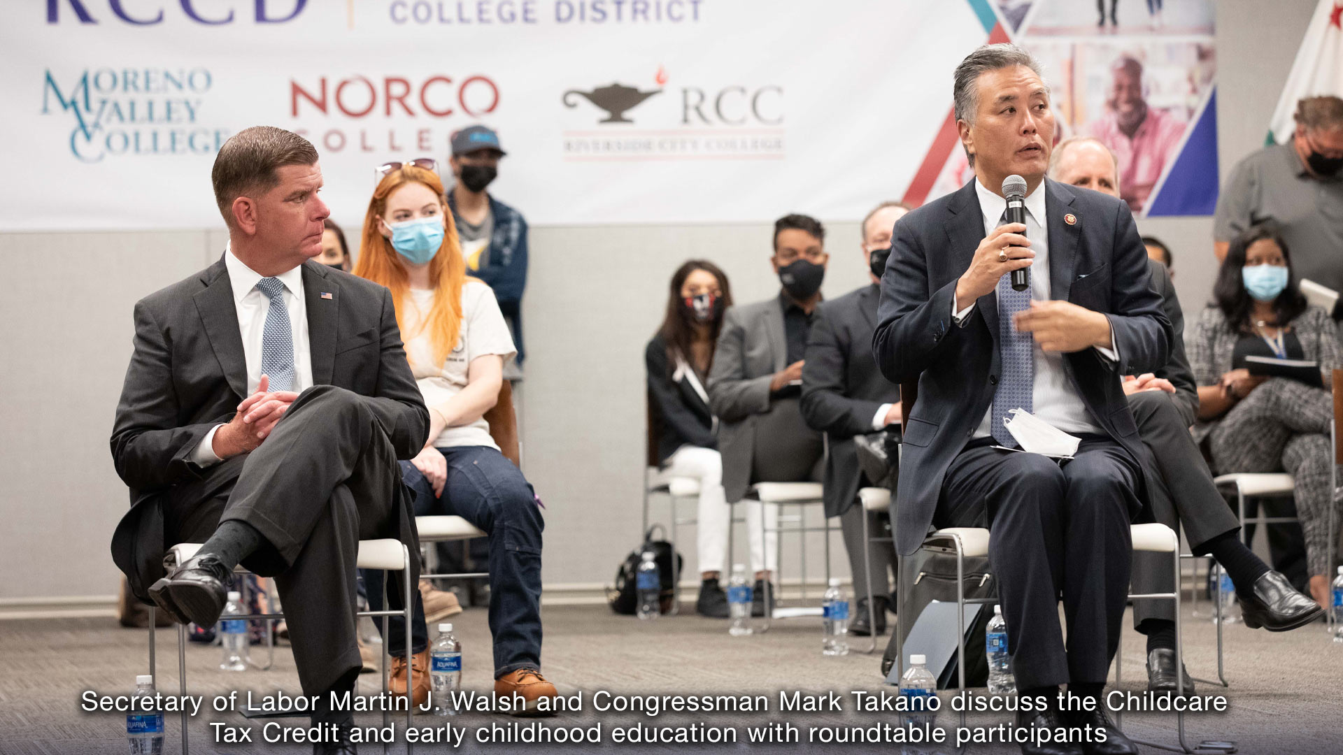 Secretary of Labor Martin J. Walsh spoke to education leaders at a round-table meeting this morning held in downtown Riverside about the Child Tax Credit and its effect on early childhood education. The meeting took place at the headquarters of the Riverside Community College District (RCCD) after a breakfast catered by the RCC Culinary Academy with Secretary Walsh, Congressmember Mark Takano and representatives of labor organizations in the Inland Empire. The secretary and congressmember are meeting with several groups about White House plans and infrastructure during a swing through Southern California.